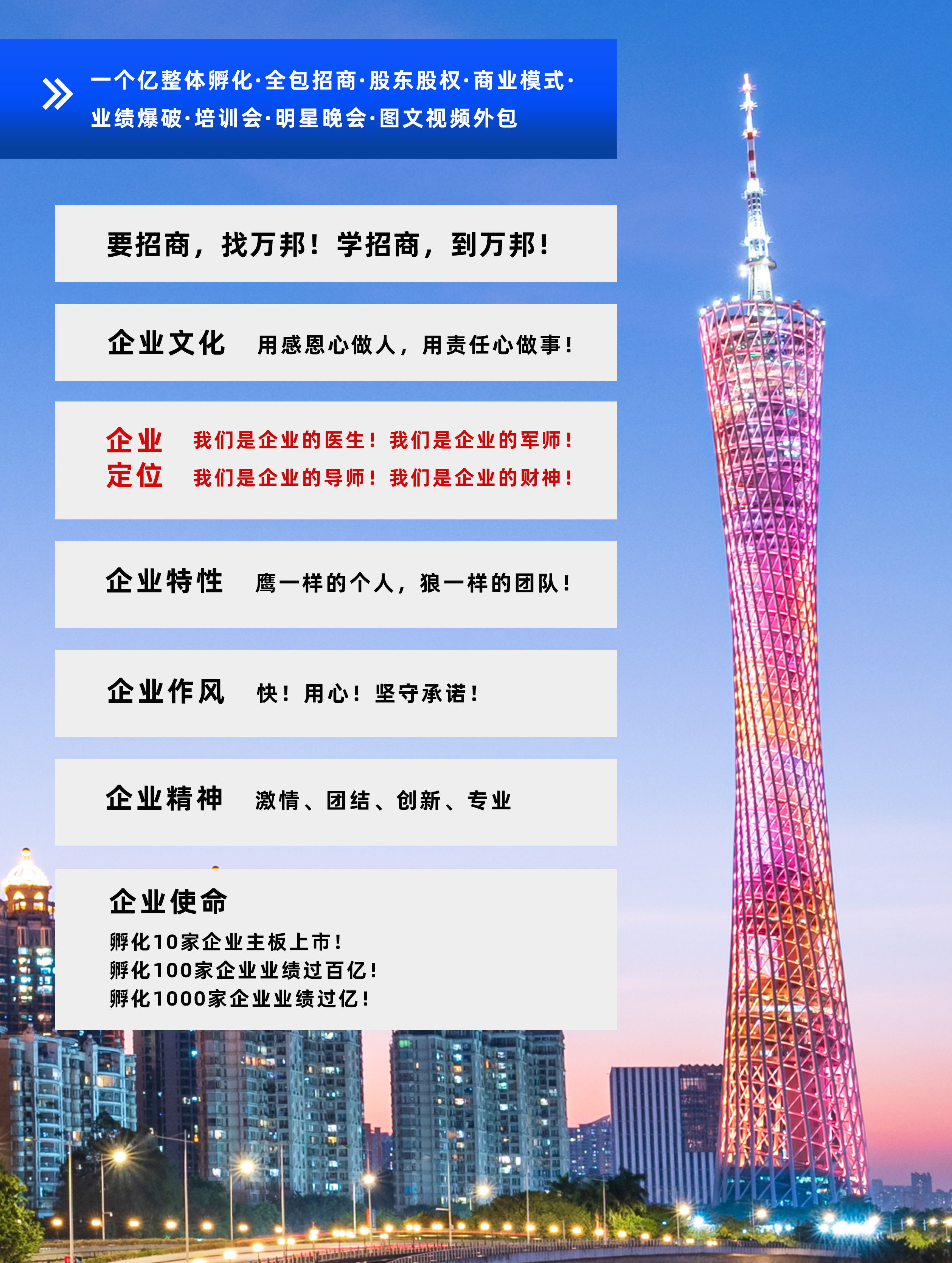 萬邦集團成立于2003年6月,專注于為企業(yè)進行招商和整體孵化,包含公司診斷、產品定位到量身打造商業(yè)模式系統,再到投人、投錢、投資源,一起干的分紅股東招募,鐵血軍團的打造,全國招商會議,為企業(yè)建立一套完善;成熟的招商系統,教育系統、培訓系統。